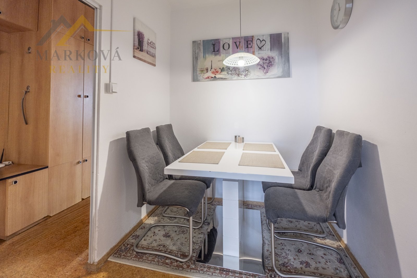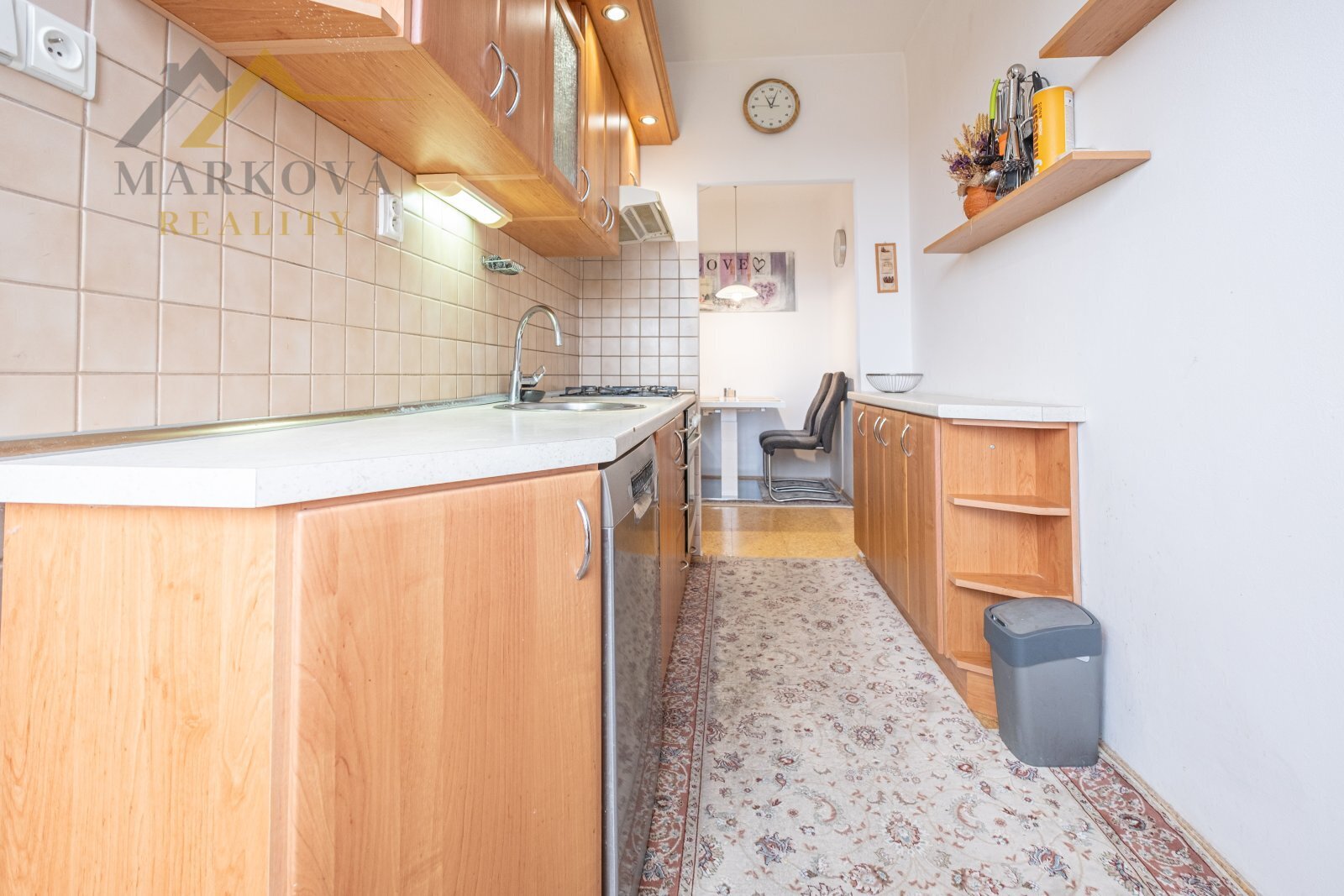 Dispozice bytu je velmi funkční. Vstupní chodba nabízí nové vestavné skříně s dostatkem úložného prostoru. Na chodbu navazuje samostatná jídelna a kuchyně s prostornou kuchyňskou linkou a výhledem na Vltavu. Obývací pokoj je centrální částí bytu, je prostorný a dobře prosvětlený. Z obývacího pokoje se vstupuje do ložnice, ze které je přístup na balkon vhodný k posezení. Třetí pokoj je samostatný a neprůchozí, ideální jako dětský pokoj, pracovna nebo pokoj pro hosty. K bytu patří také sklepní kóje v suterénu domu.