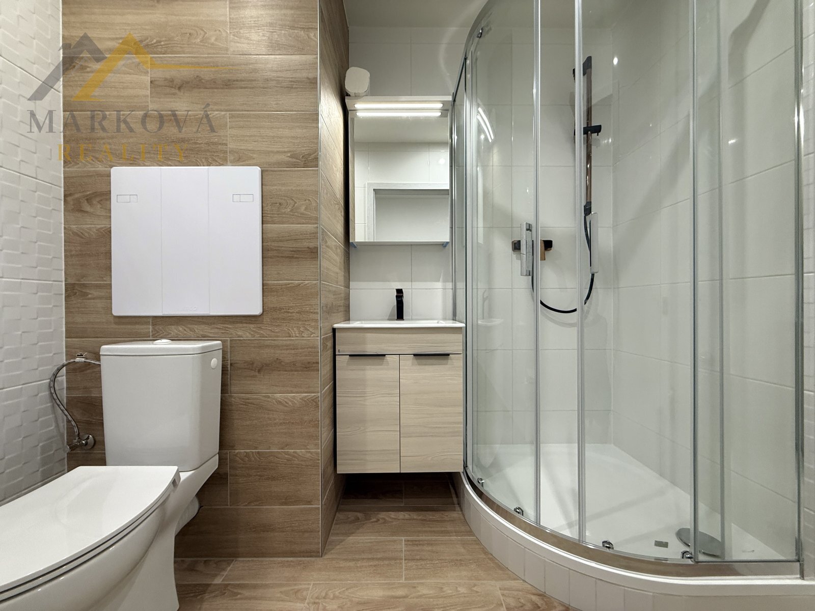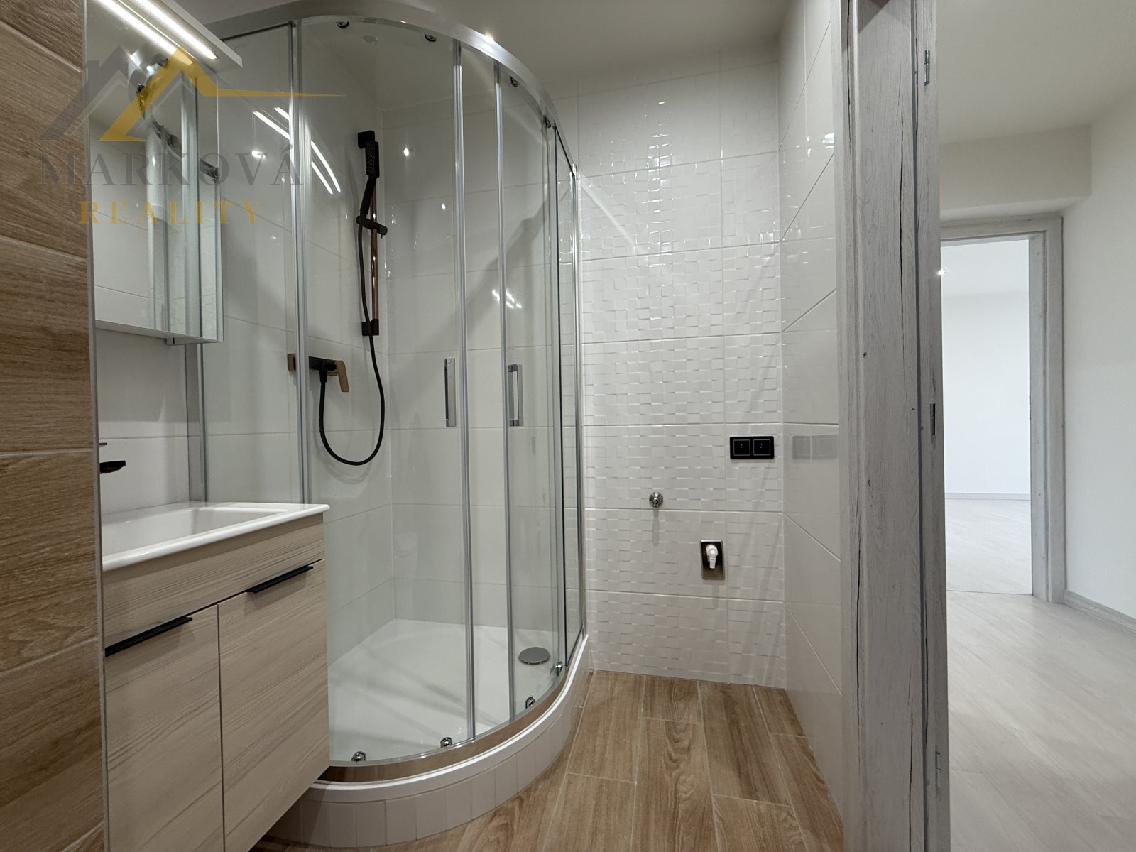 Dispozice bytu je řešena velmi prakticky. Koupelna nabízí sprchový kout, umyvadlo a toaletu. Kuchyňská linka na míru od truhláře podtrhuje kvalitu celé rekonstrukce a poskytuje dostatek úložného prostoru.