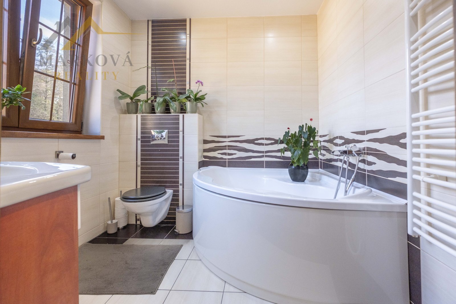 Byt nabízí dvě samostatné ložnice a dvě koupelny, což výrazně zvyšuje komfort bydlení. Jedna z ložnic má vlastní stylově skrytou koupelnu se sprchovým koutem a prostorem pro pračku a sušičku. Tvoří tak diskrétní samostatnou koupelnu pro hlavní ložnici. Druhá koupelna je vybavena rohovou vanou, umyvadlem a toaletou, je přístupná přímo z obývacího pokoje a nabízí nám výhled přímo do otevřené přírody.