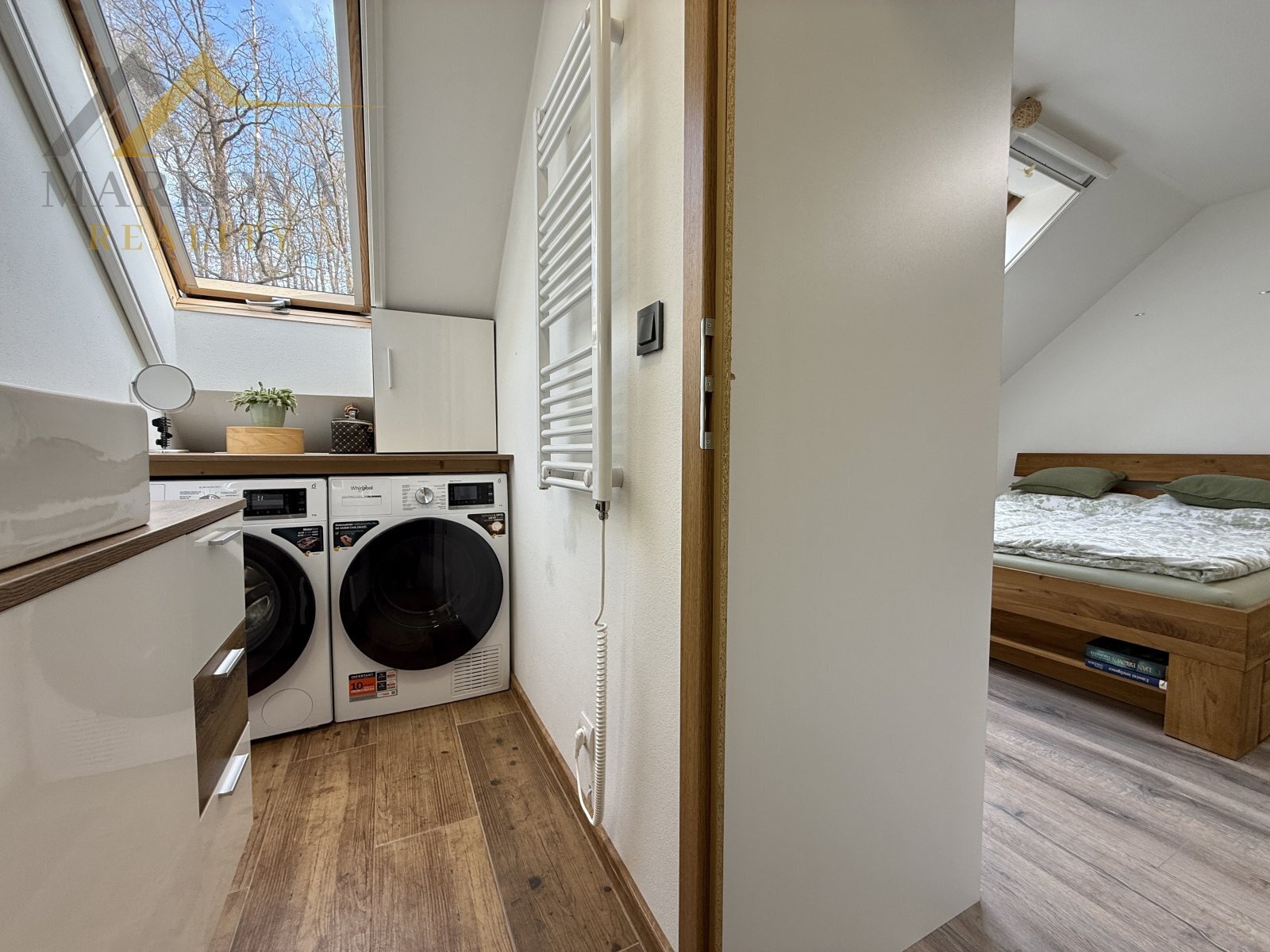 Byt nabízí dvě samostatné ložnice a dvě koupelny, což výrazně zvyšuje komfort bydlení. Jedna z ložnic má vlastní stylově skrytou koupelnu se sprchovým koutem a prostorem pro pračku a sušičku. Tvoří tak diskrétní samostatnou koupelnu pro hlavní ložnici. Druhá koupelna je vybavena rohovou vanou, umyvadlem a toaletou, je přístupná přímo z obývacího pokoje a nabízí nám výhled přímo do otevřené přírody.