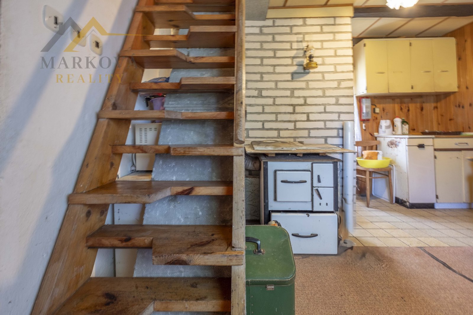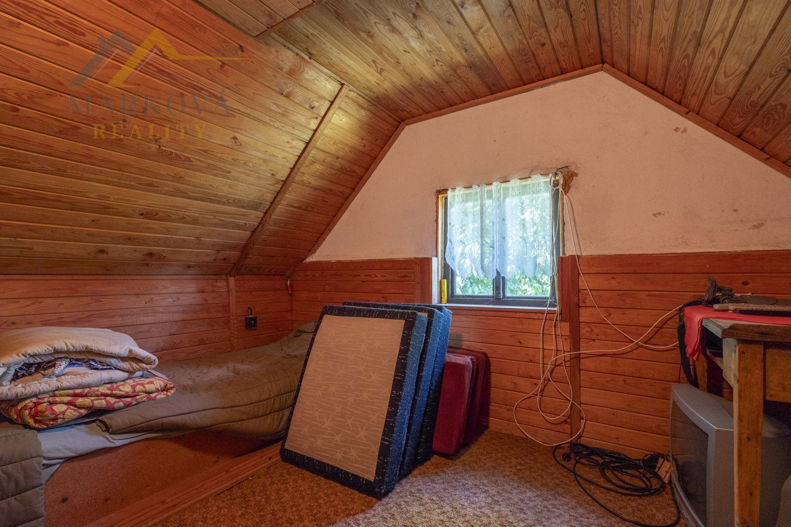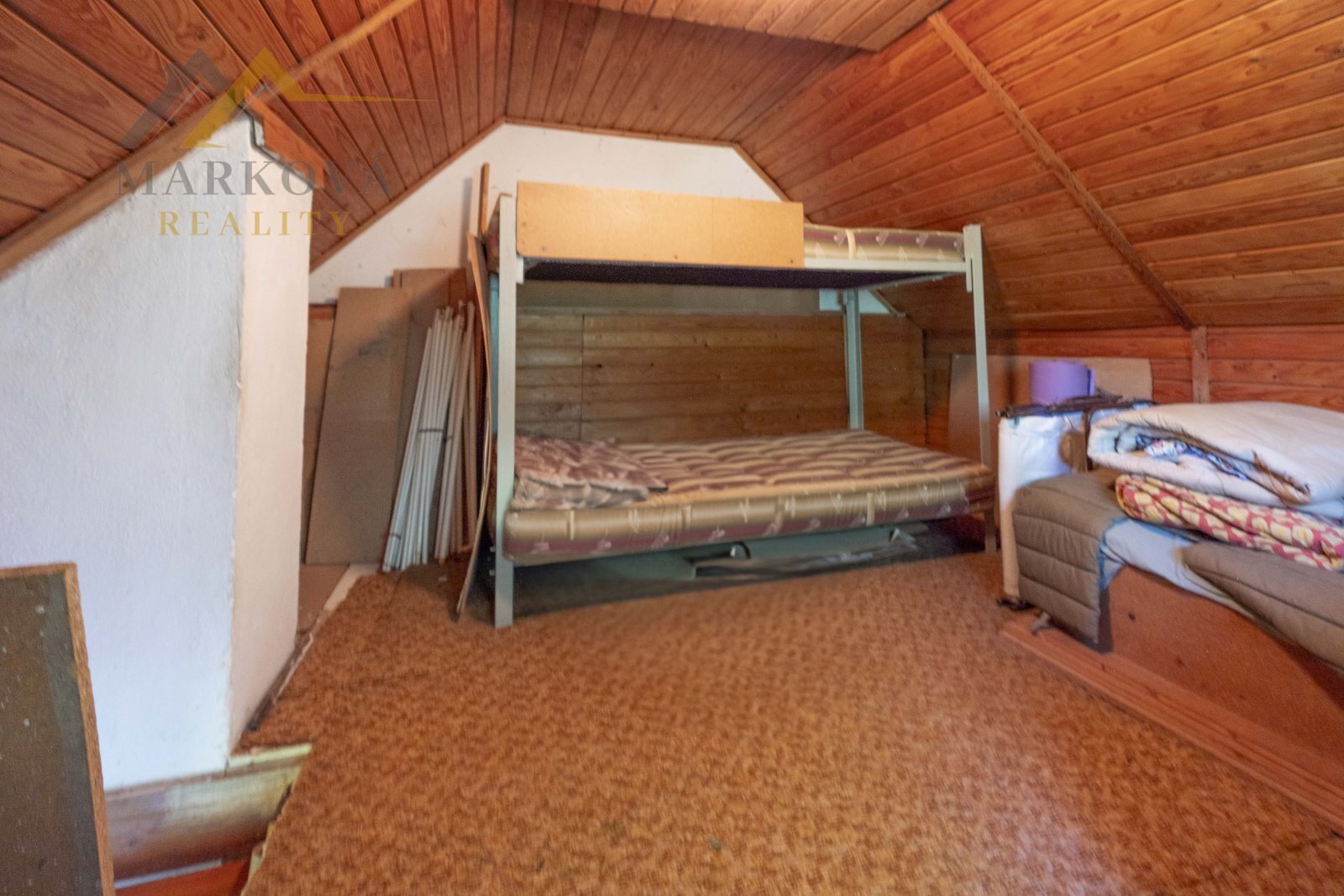 Současná stavba z roku 1988 je ve velmi dobrém technickém stavu. Nabízí dvě obytná podlaží, přičemž i horní patro disponuje plnohodnotnou výškou stropu. Celý objekt je kompletně podsklepený, sklep je suchý a prostorný – ideální pro uložení zahradního nářadí, sportovního vybavení či zázemí pro dílnu. Voda je napojena na obecní vodovod, elektřina samozřejmostí, odpad sveden do septiku. Vytápění zajišťují kamna na tuhá paliva a nechybí splachovací toaleta. Chata je připravena k dalším úpravám a dovybavení dle představ nového majitele.