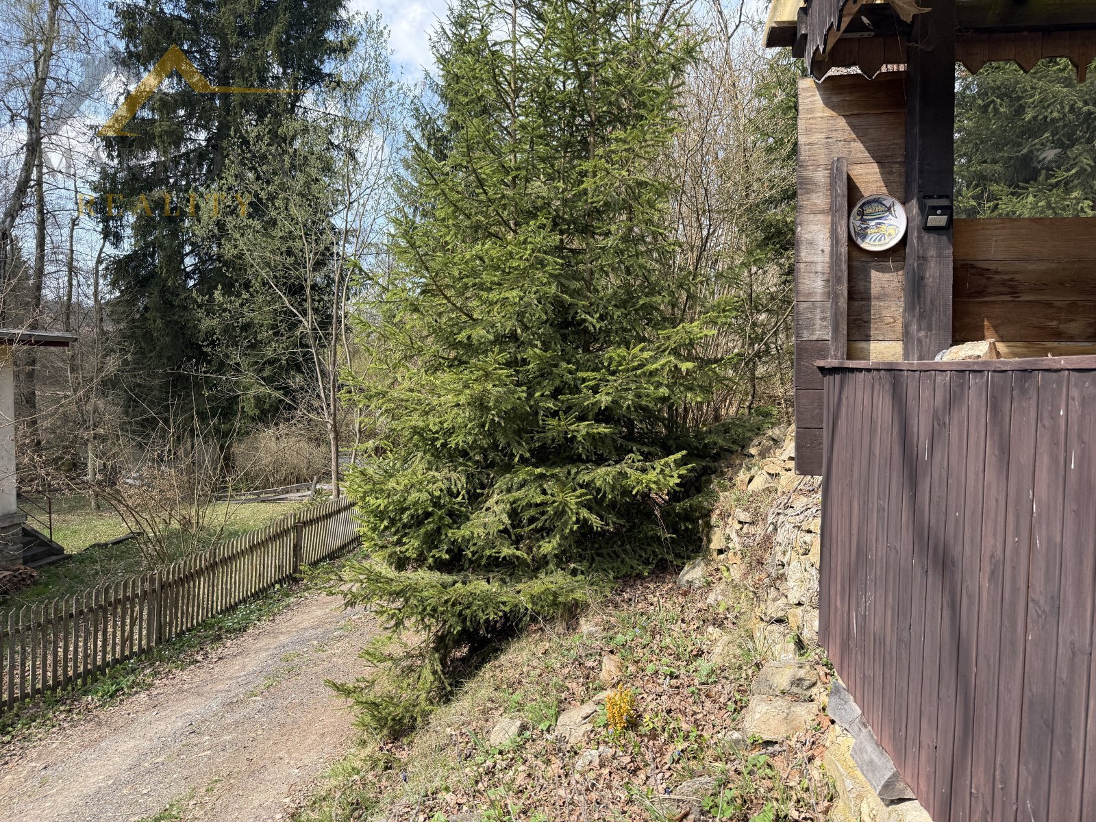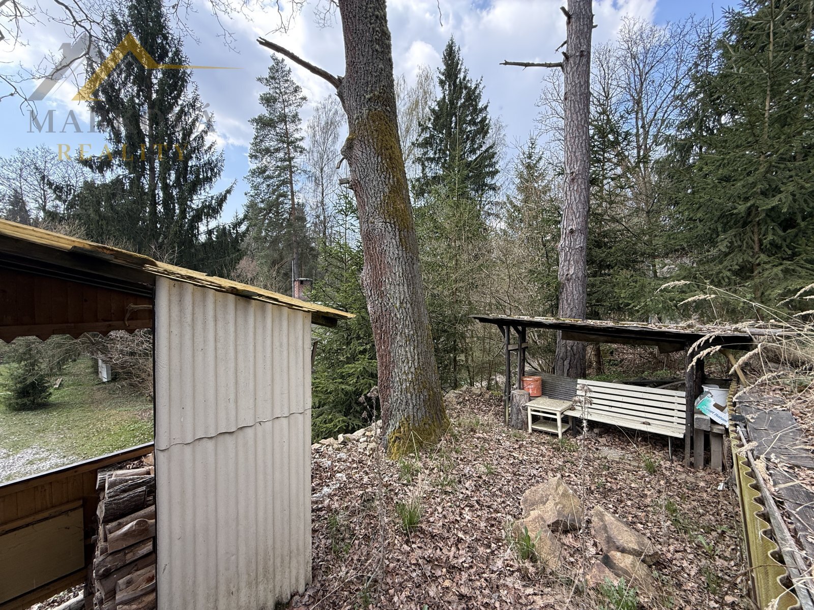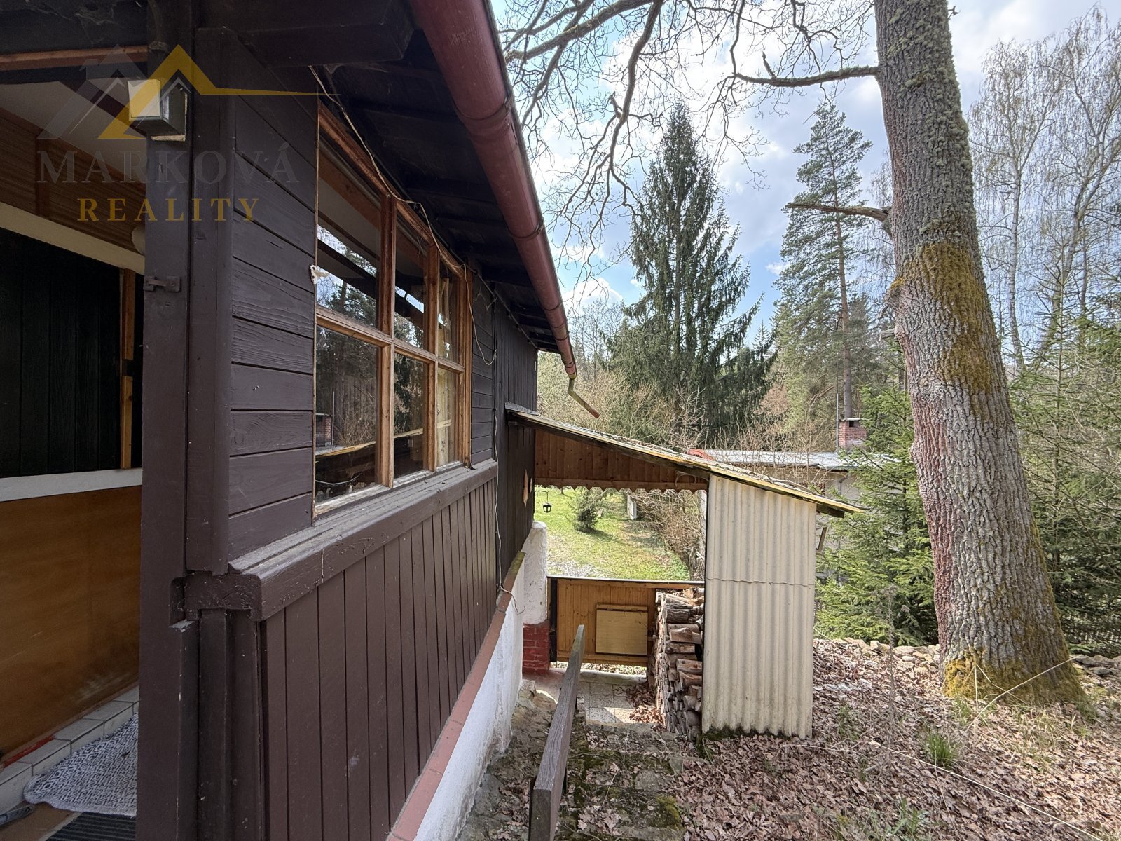 U horní části chaty se nachází praktická kůlna na dřevo či zahradní vybavení. Dále je zde prostor pro ohniště a posezení s výhledem na rybník.