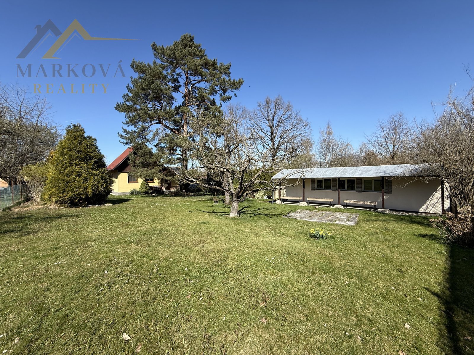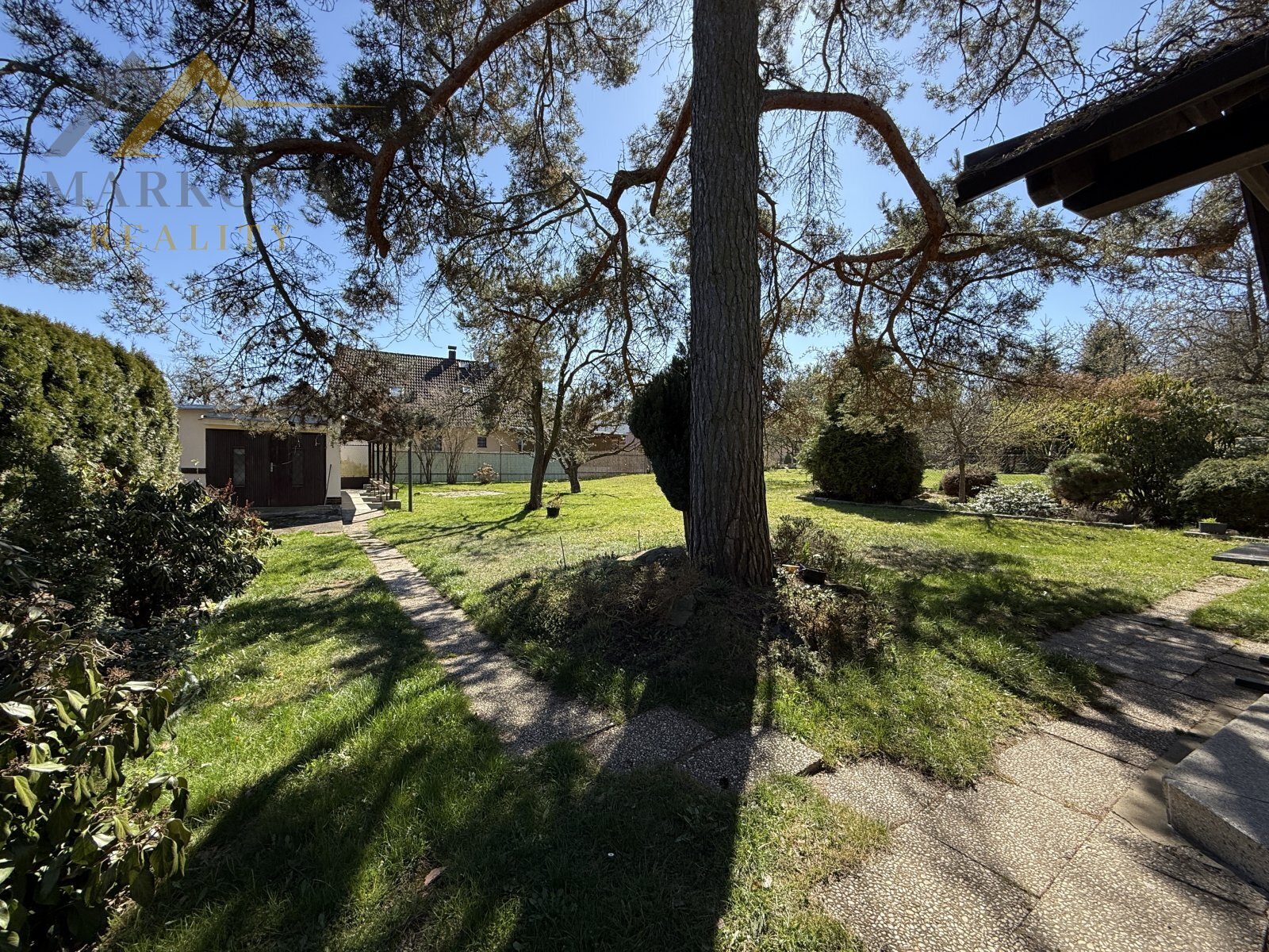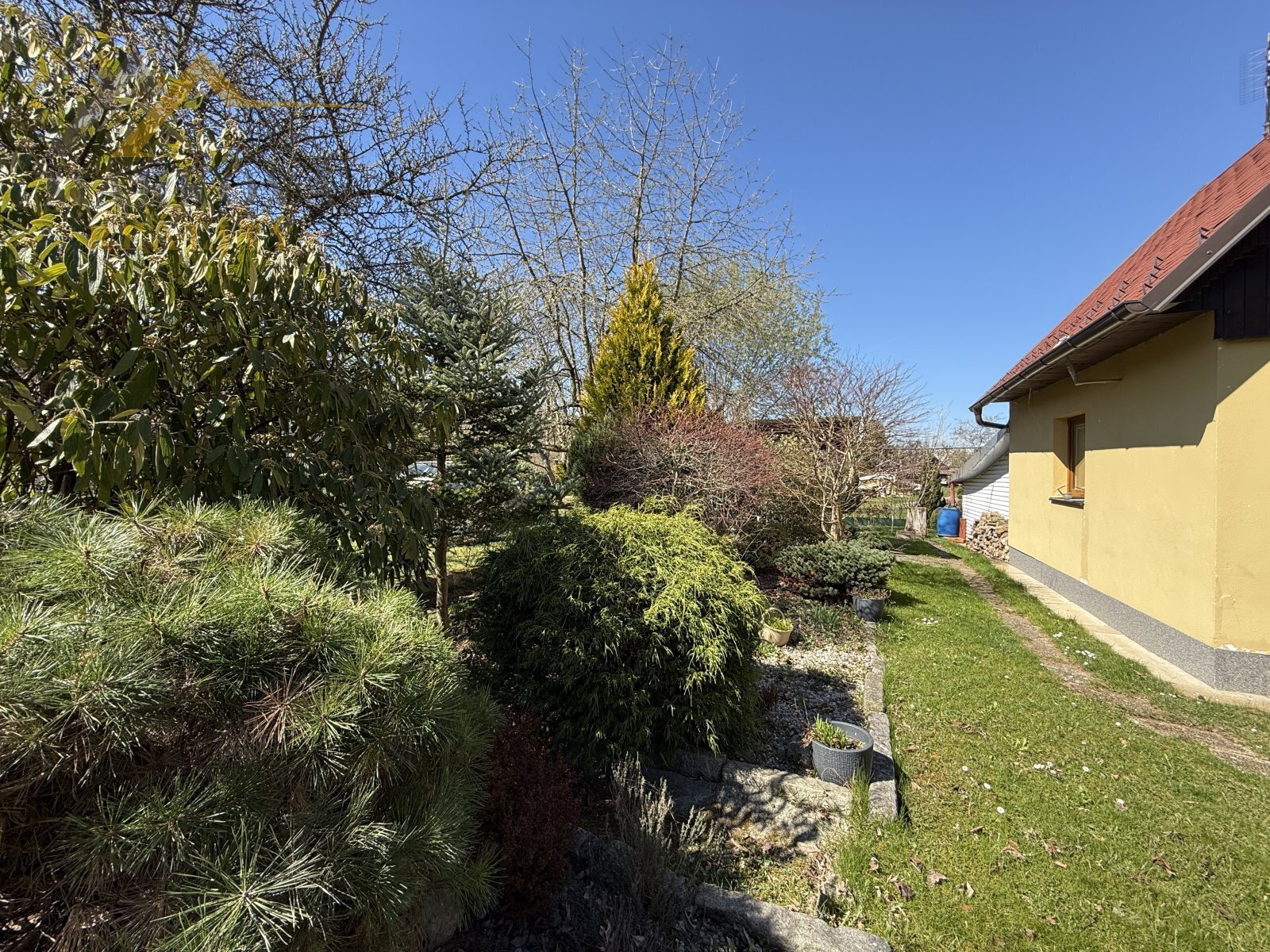 Pozemky dohromady vytvářejí rovinatou, pečlivě udržovanou okrasnou zahradu se vzrostlými stromy, která zajišťuje naprosté soukromí a příjemnou atmosféru pro každodenní život i odpočinek.