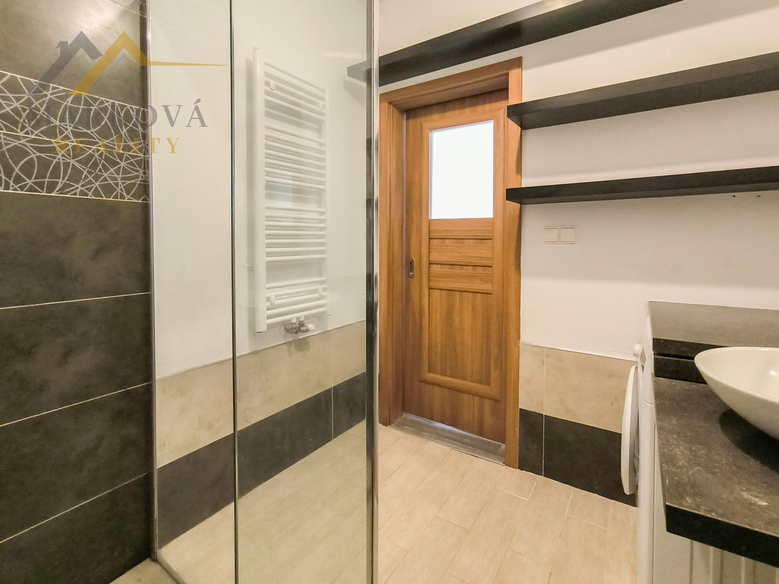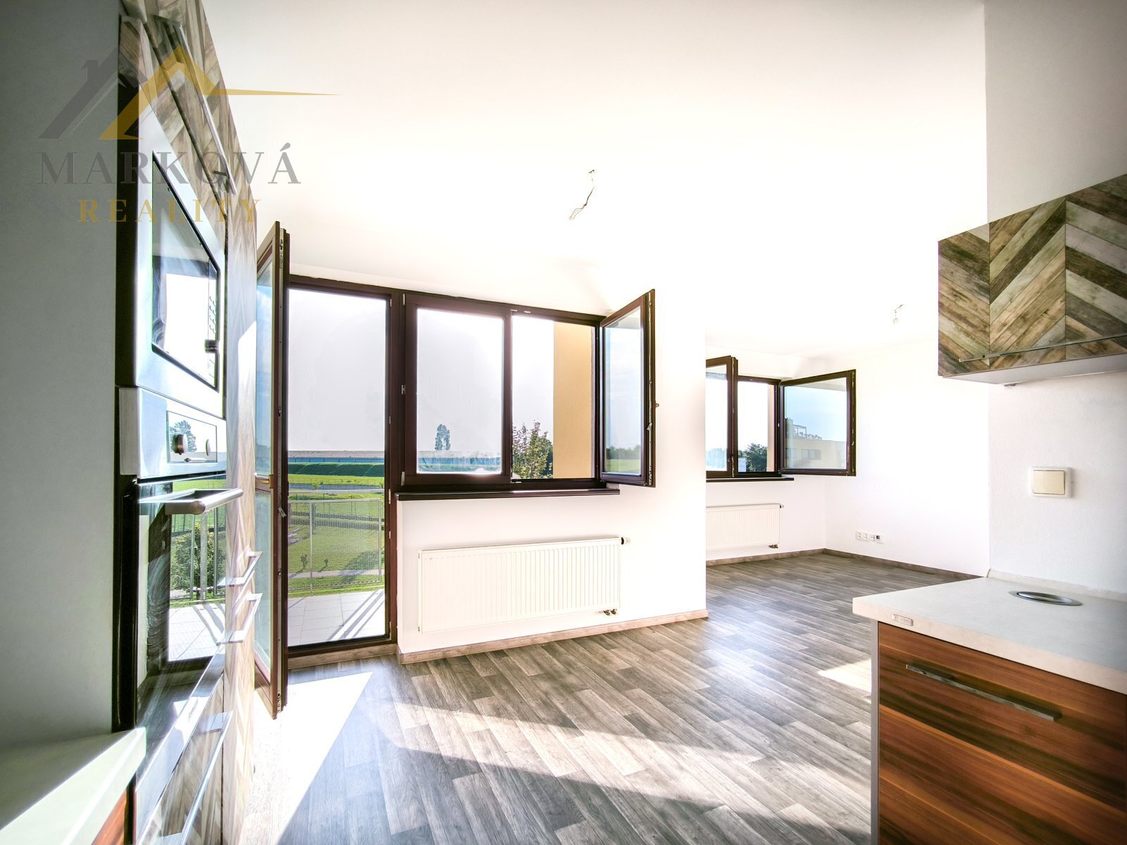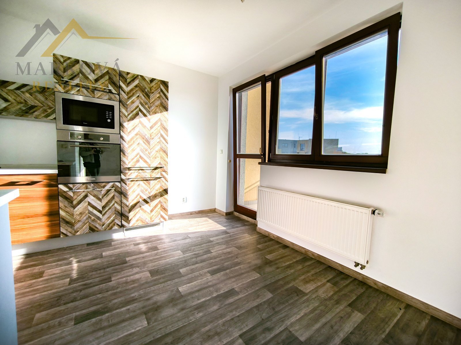 Interiér bytu je světlý. Koupelna je vybavena sprchovým koutem, umyvadlem, toaletou a pračkou. Kuchyňský kout je vybaven moderními spotřebiči a skříňkami s dekorativním vzorem. K bytu náleží balkon o velikosti 7 m2 s příjemným výhledem do zeleně.